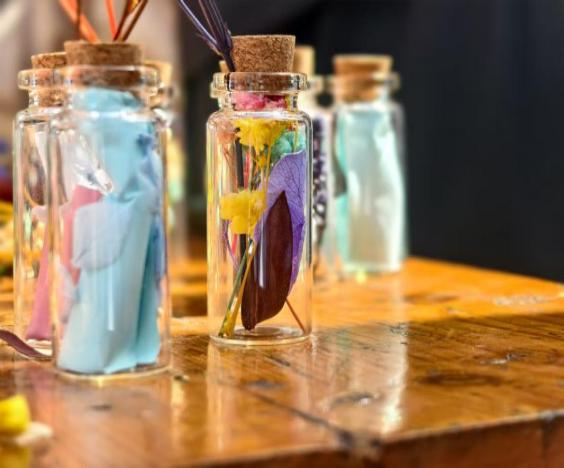 活动以小玻璃瓶为载体,将彩色的花与树叶封存入瓶,让自然的诗意与内心的独白在此相遇。