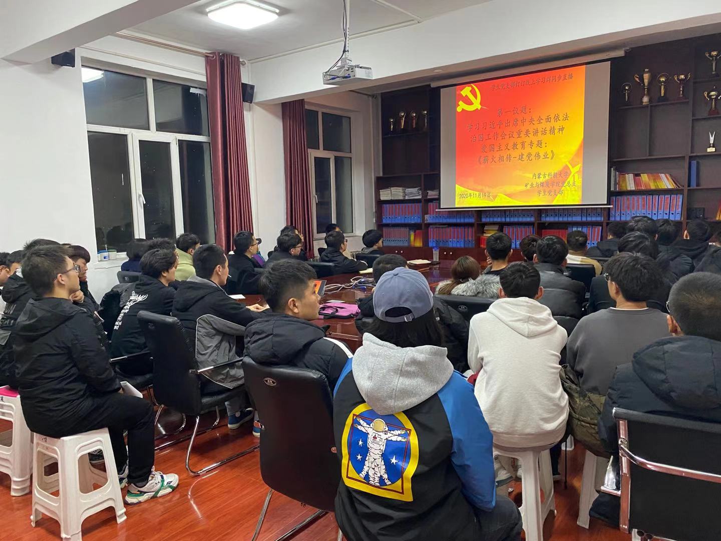 为大力弘扬爱国主义精神,矿业与煤炭公司党总支于2020年11月19日晚上19:30,在临曦楼二楼党员之家线上线下同步开展专题理论学习活动。本次学习内容是:第一议题:学习习近平出席中央全面依法治国工作会议重要讲话精神;爱国主义教育专题:观看《薪火相传-建党伟业》视频。