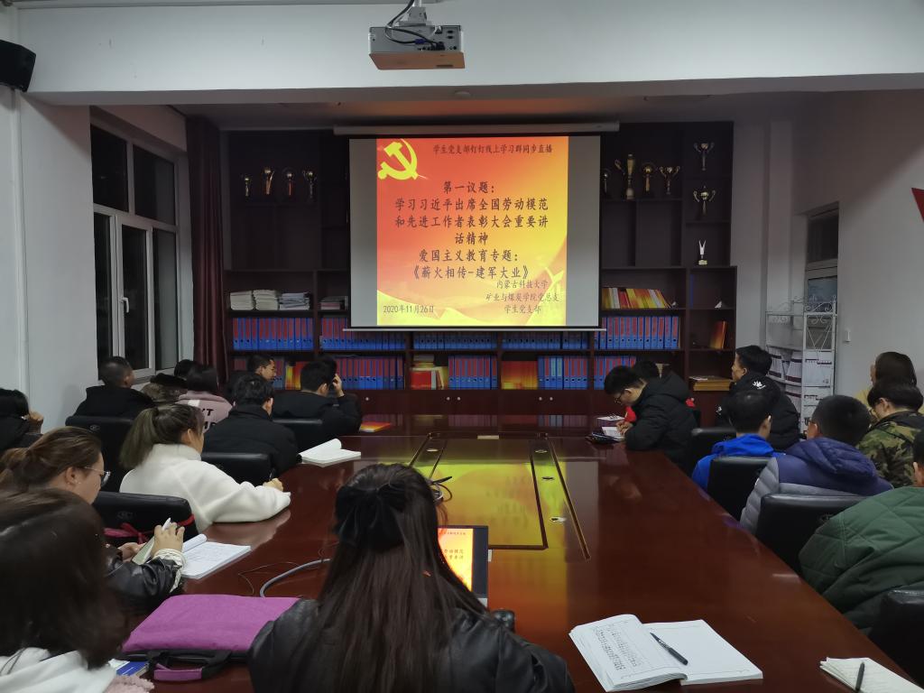 为大力弘扬劳模精神,激励和带动全体员工,矿业与煤炭公司党总支于2020年11月26日晚上19:30,在临曦楼二楼党员之家线上线下同步开展专题理论学习活动。本次学习内容是:第一议题:学习习近平出席全国劳动模范和先进工作者表彰大会重要讲话精神;爱国主义教育专题:观看《薪火相传-建军大业》视频。